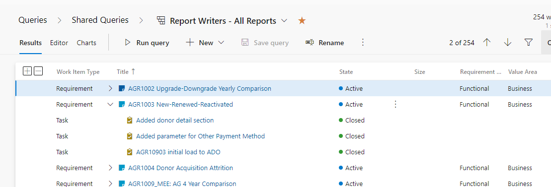ADO has a variety of work item types. For linked reports, each report is a requirement, and all updates are done with child tasks linked to the requirement. The easiest way to see all Atlas linked reports is to look at Queries/Shared Queries/Report Writers – All Reports, or click here.