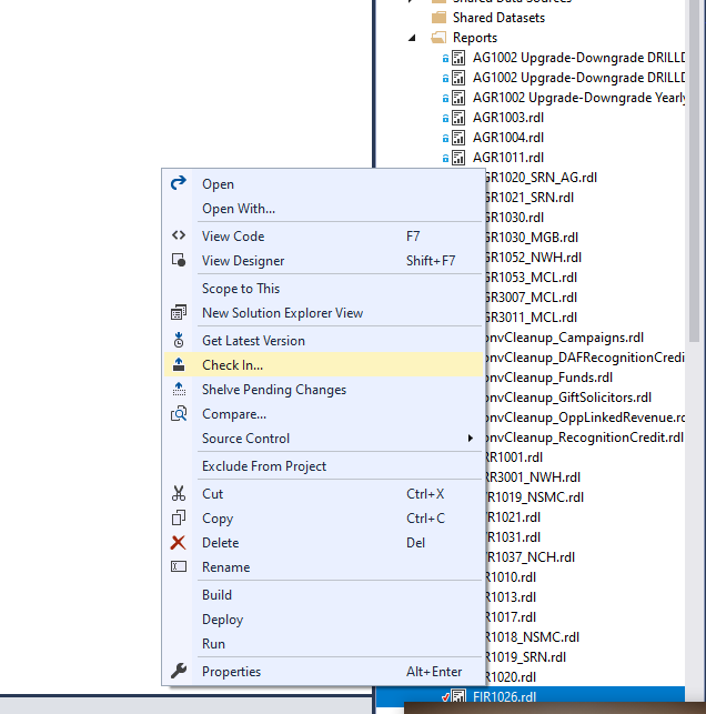 Once you have received final approval for your changes, you will check in the report. You can right-click and choose Check In.