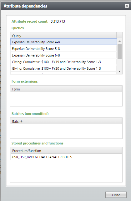 When an attribute is “retired,” it can’t be deleted if it is used in a query or anywhere else. The dependencies report makes it easy to find references to attributes. This can be launched directly from the Attribute Categories list: