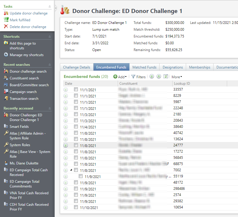 Click on the task “Update donor challenge” to add qualifying donations to the encumbered funds tab. Depending on the challenge, you may want to schedule this process to run nightly or weekly. You can also add revenue that would not ordinarily qualify for the challenge by clicking the Add button.