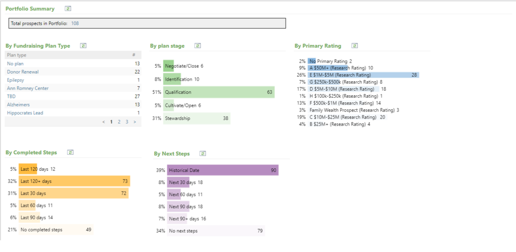 The Portfolio Summary tab groups and summarizes the prospects in the Fundraiser’s portfolio in the following charts: