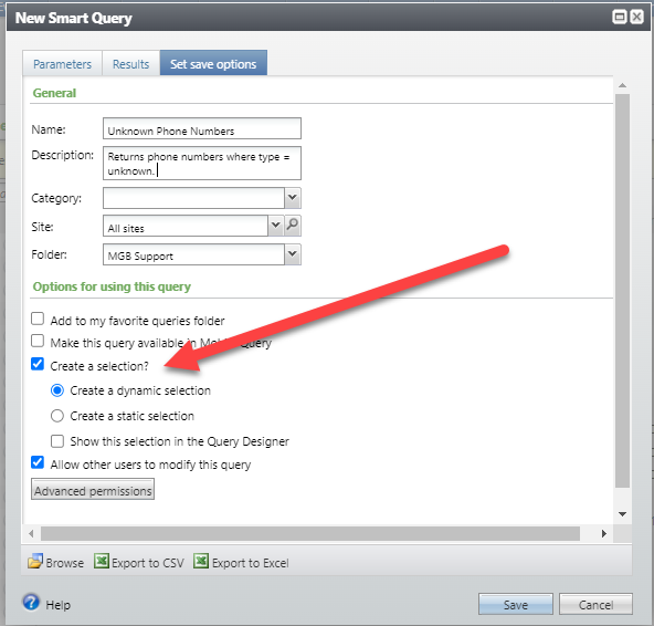 - Fill out the Parameters tab. It’s optional, but be sure you don’t create a Selection that returns (for example) every phone number in the database.