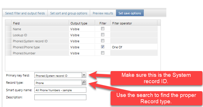- include the System record ID for the record type you’re selecting; in this example, we’re building a selection of Phone records, so the result set includes Phones\System record ID.