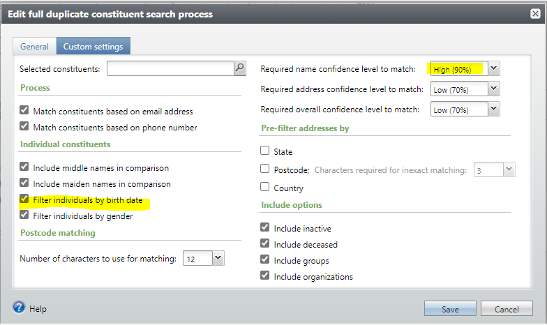 - Set Required Name Confidence level to High (90%); this helps when people with similar names live at the same address.