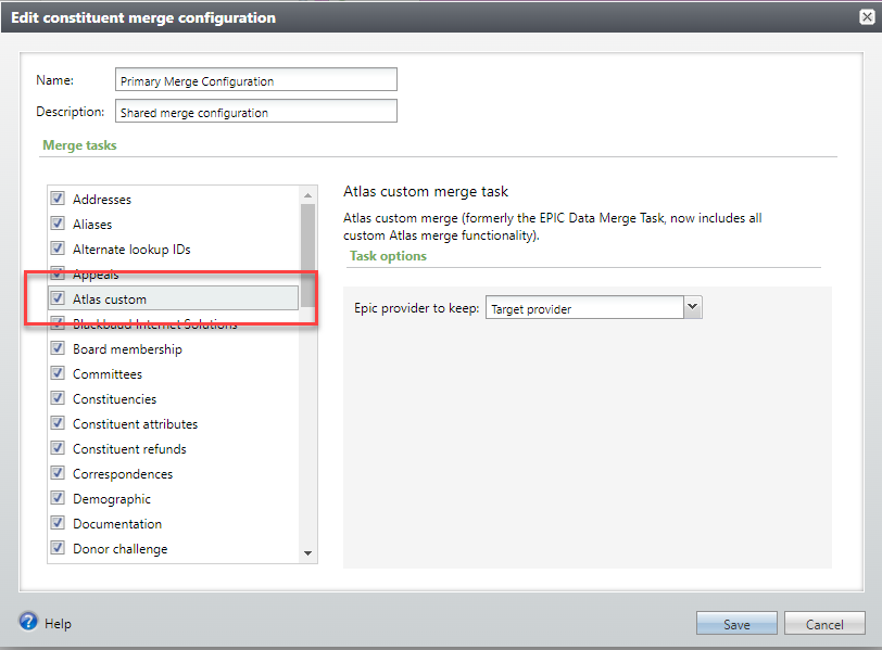 - Besides the custom addresses merge task referenced above, all other custom Atlas functionality is included in a single merge task called Atlas custom; this task includes the code to merge Epic data, custom tribute acknowledgee data, and custom stewardship participant data.
