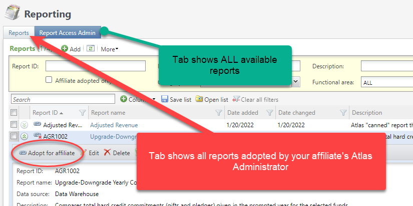When MGB adds a new report we push it out to all affiliates. All reports that have already been adopted for your affiliate by your affiliate’s Atlas Administrator appear on the “Reports” tab. If you hear of a report that you don’t see on the “Reports” tab, please contact your Atlas Administrator or add a ticket and the EDO can adopt it for you.