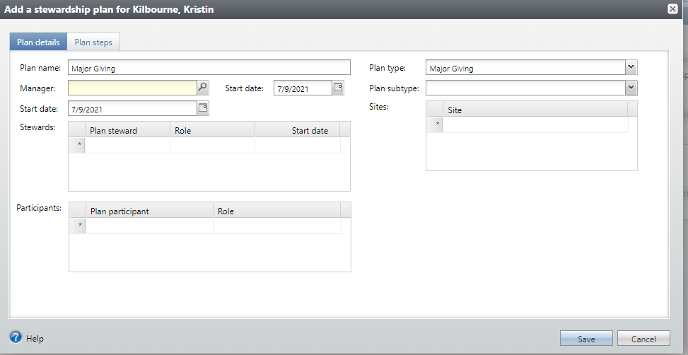 Stewardship plans are similar to fundraising plans in that they each have related steps. But stewardship plans can have recurring steps (for example, send a birthday card every year on 10/1), and stewardship plan steps can be linked to fundraising plans.